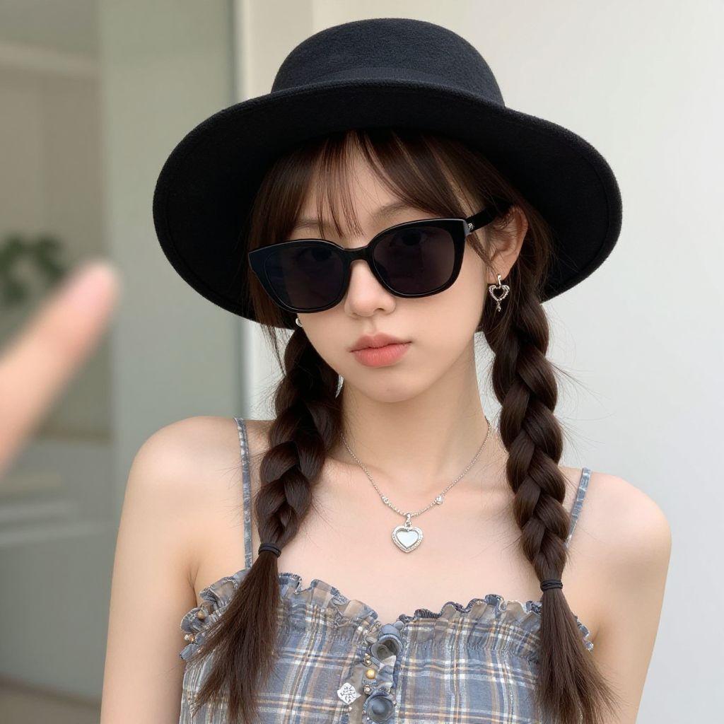 Photograph of a young woman with fair skin and blue eyes, wearing a black wide-brimmed hat adorned with gold fringe and a circular brooch. She has a long brown braid over her right shoulder, a bright red scarf around her neck, and a pink flower clip. Her outfit includes a black and white top with a gold necklace. The blurred background suggests an outdoor urban setting with indistinct people. The woman's expression is gentle and she is looking directly at the camera. The overall style is vibrant and festive.