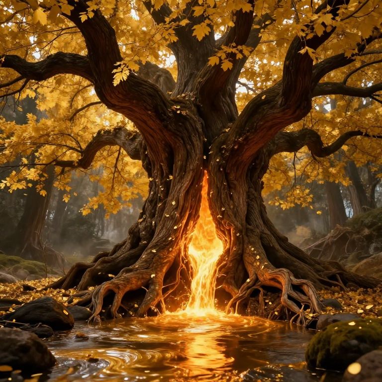 A colossal, gnarled tree with golden leaves stands defiantly as its trunk splits open, revealing a glowing, molten core that spills into a river of liquid gold, defying the boundaries between earth and fire.