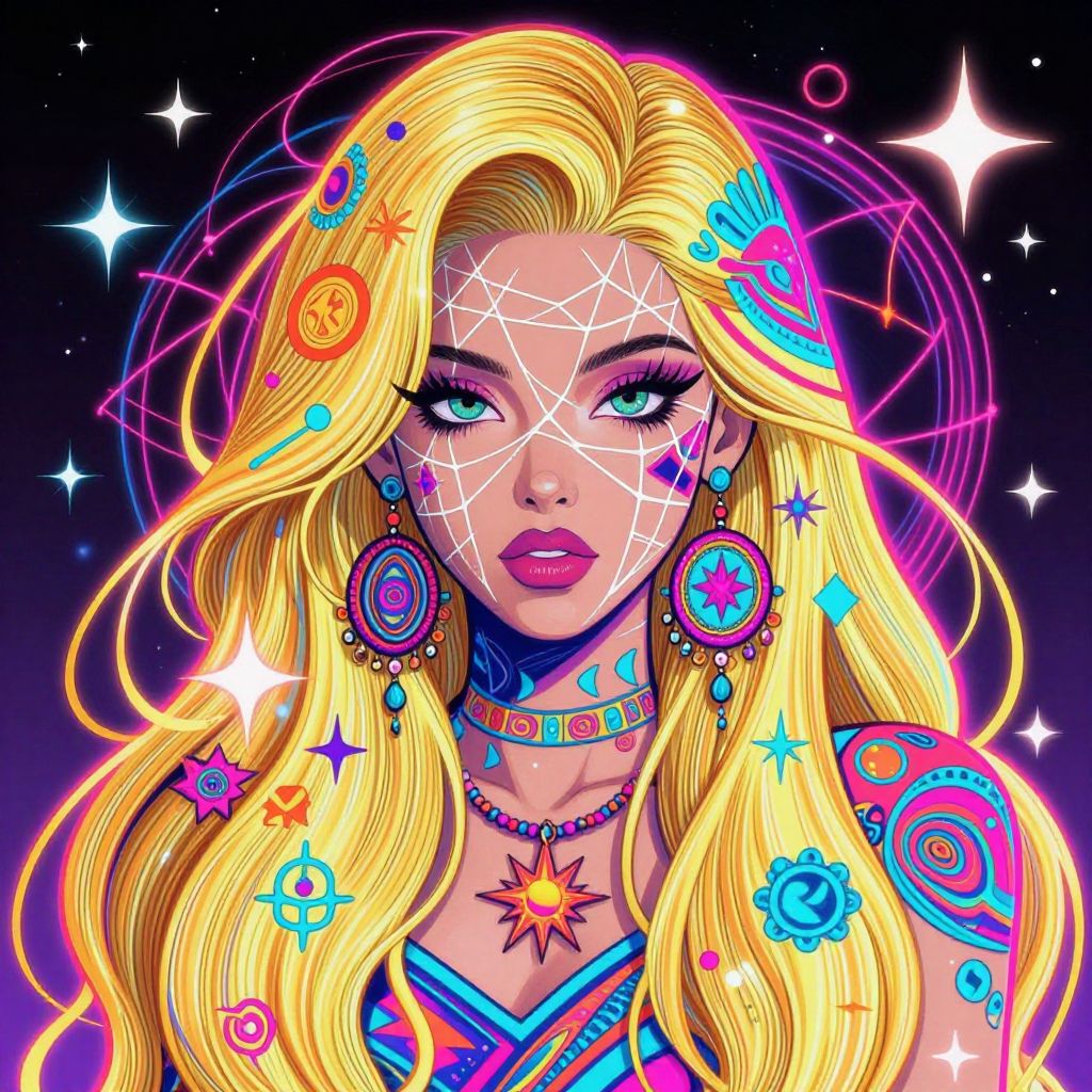 The image is a highly detailed and vibrant illustration of a woman with long, flowing blonde hair adorned with intricate patterns and symbols. Her face is partially obscured by a web-like design, adding a mystical and ethereal quality to her appearance. She wears large, ornate earrings and a necklace with a star-like pendant, both complementing her elaborate hairstyle. The background features a dark, starry sky with a glowing, neon-like aura, enhancing the otherworldly atmosphere. The overall composition is balanced, with the woman centrally positioned, and the intricate designs and patterns creating a sense of depth and complexity. The use of neon colors and the detailed line art mixed with photography give the image an 80s flair, making it visually striking and engaging.