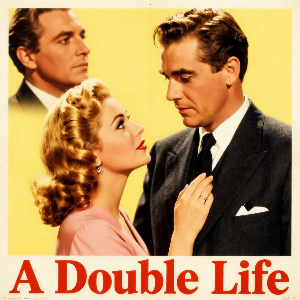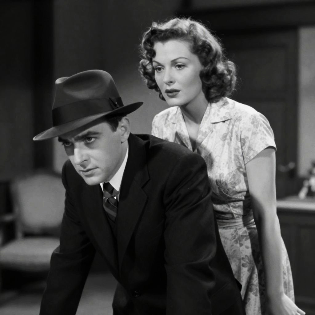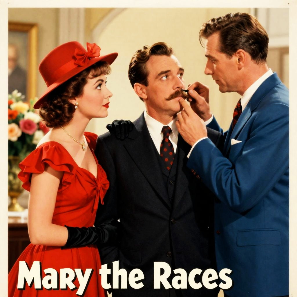 Vintage movie poster of "The Mulled Tea" featuring a man in a dark suit and hat, looking down with a slight smile, and a woman in a blue dress with white collar, gesturing with her right hand. Both have intense expressions. Background includes wooden structures and a ladder.