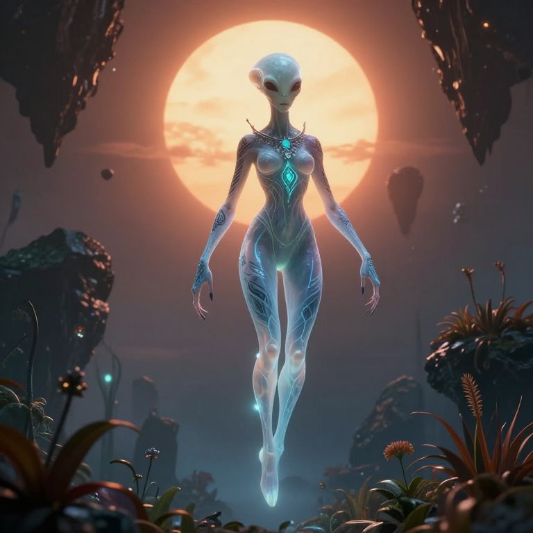 Alien OC maker designing a mysterious interstellar being with elongated limbs, translucent skin revealing glowing veins, adorned with tribal markings and ethereal jewelry, floating in an alien landscape filled with alien flora and floating rocks under twin suns.