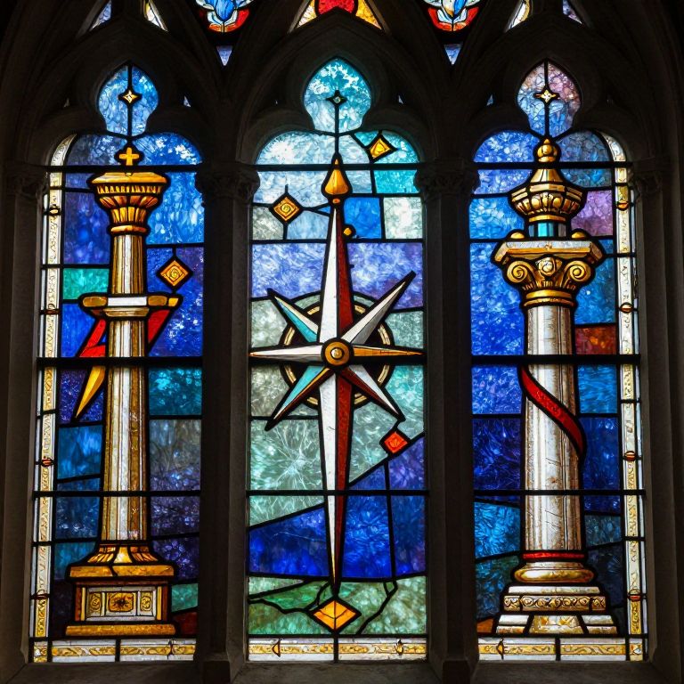 Stained glass window depicting two ornate columns with star-shaped central design, surrounded by vibrant blue, red, and yellow glass.