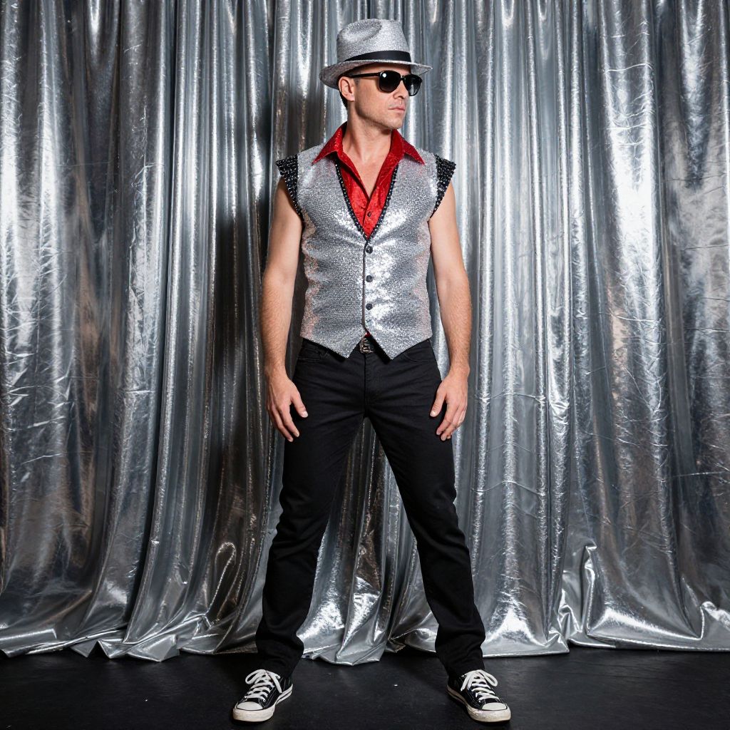 A photograph of a stylish man standing in front of a shiny, metallic silver curtain. He's wearing a silver sequined vest over a red shirt, black pants, and black sneakers with white laces. He's also sporting a silver hat and sunglasses. The lighting creates a dramatic, reflective effect on the curtain, highlighting his outfit. The overall vibe is glam-rock or stage performer.