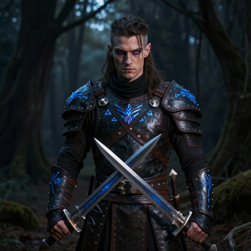 Curly black hair blue eyes male, fantasy setting, wearing intricate leather armor, glowing blue eyes, dynamic pose, forest background with magical light effects