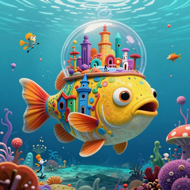 Vibrant digital illustration of a colorful fish with a miniature, whimsical castle inside a glass dome, swimming in a lively underwater scene with various fish