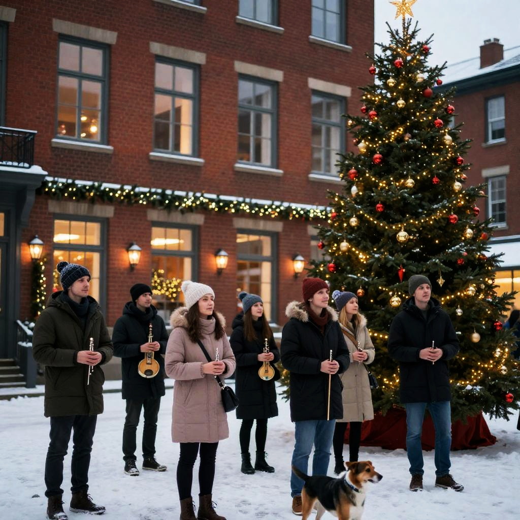 Photograph of a festive scene. Two dark brown horses with black harnesses, driven by a man in a black coat and hat. Christmas trees adorned with lights and red ribbons on either side. Three people walking in the background, one wearing a brown coat, another a gray coat, and the third in a red and gray jacket. Snow on the ground, green trees in the background. The horses are in the center, facing forward.