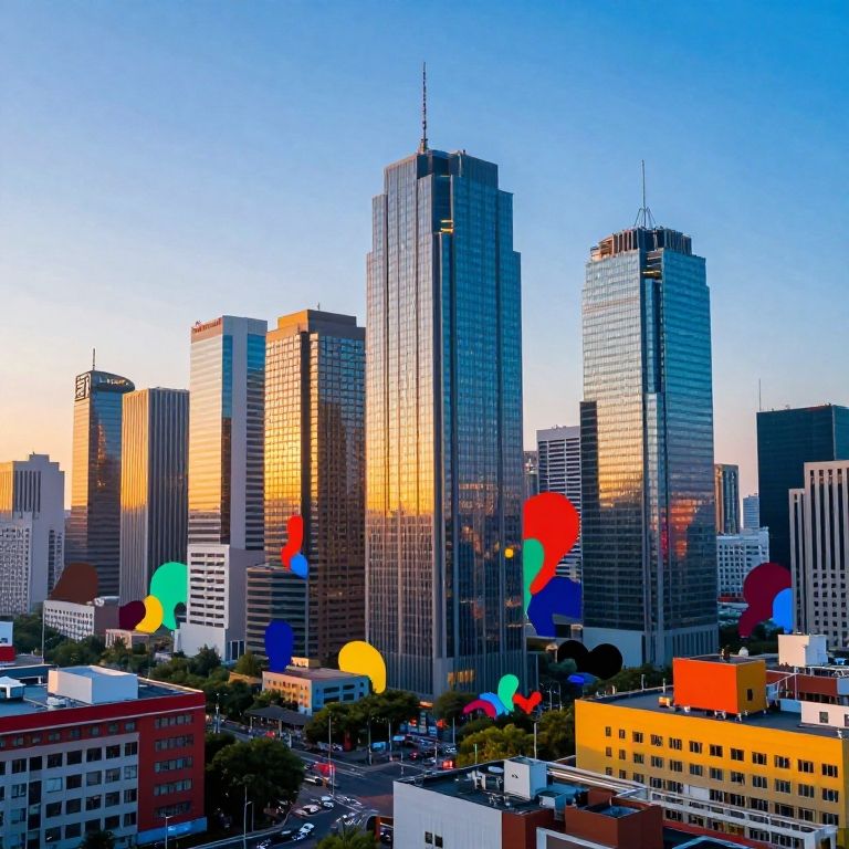 Primario theme in a vibrant cityscape at dawn, colorful architectural elements blending with abstract shapes, dynamic lighting highlighting urban energy, infused with modern digital art style, sharp contrasts and vivid color palette