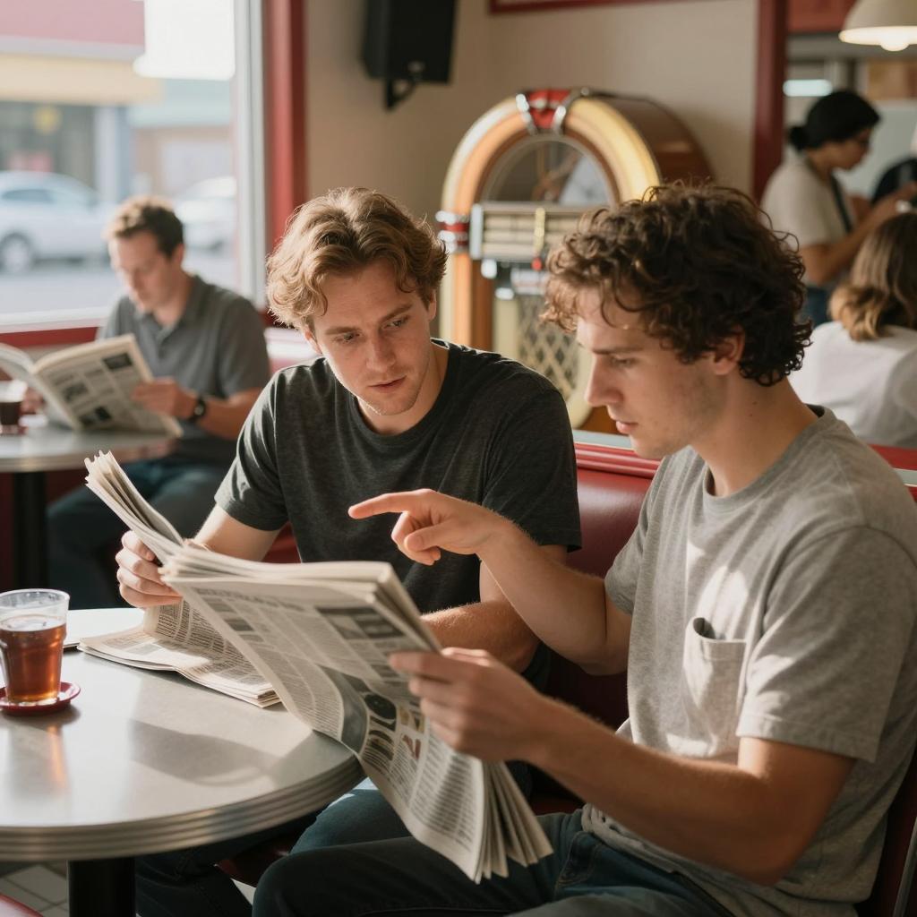 Photograph of a diner. Two men in the foreground, one pointing, both reading newspapers. Casual attire. Background includes another man reading, tables, chairs, sunlight through windows, and a jukebox. Warm, dimly lit setting. Multiple people in background.