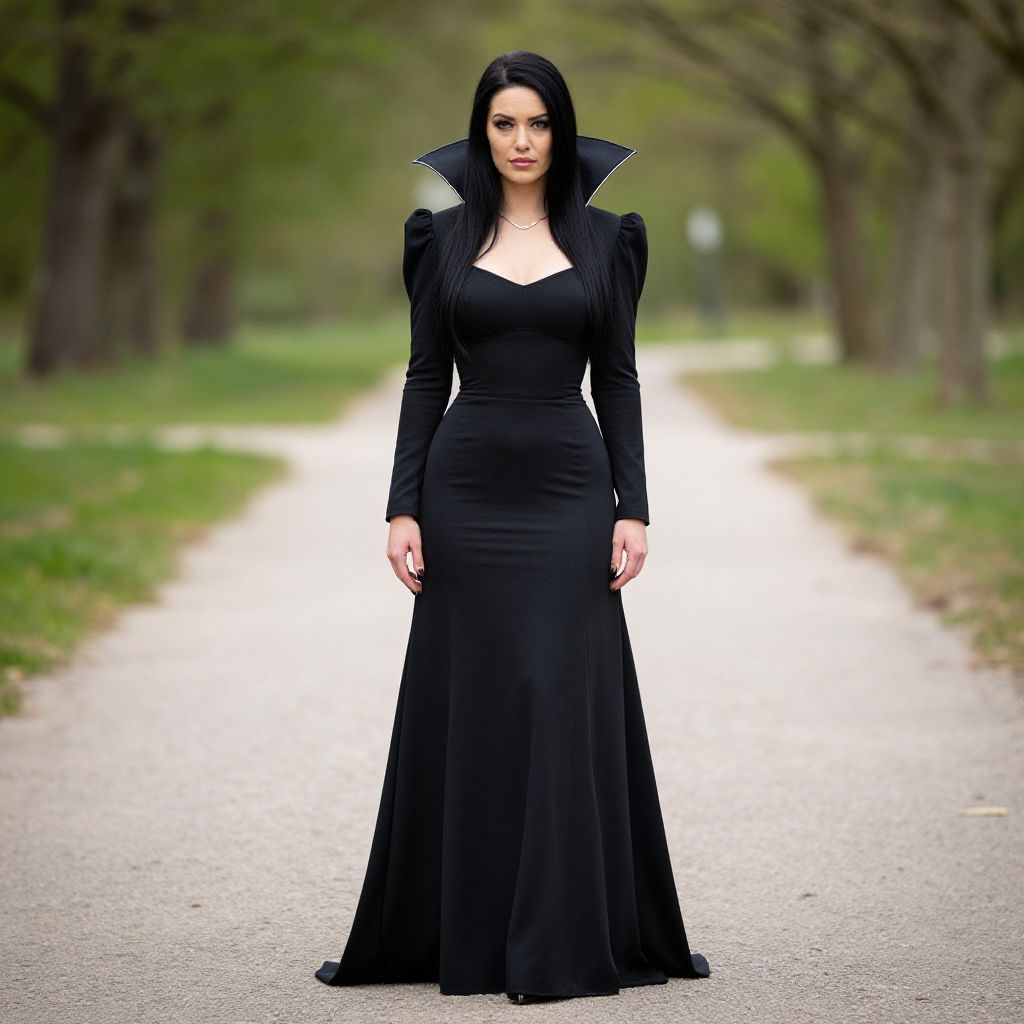 "Woman Draculaura Costume, woman in a black dress standing on a path"