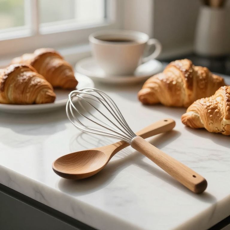 Whisk and wooden spoon crossed on a marble countertop, surrounded by freshly baked croissants and coffee cup, shallow depth of field, warm morning light streaming through window, evokes a peaceful breakfast preparation mood, photorealistic rendering.