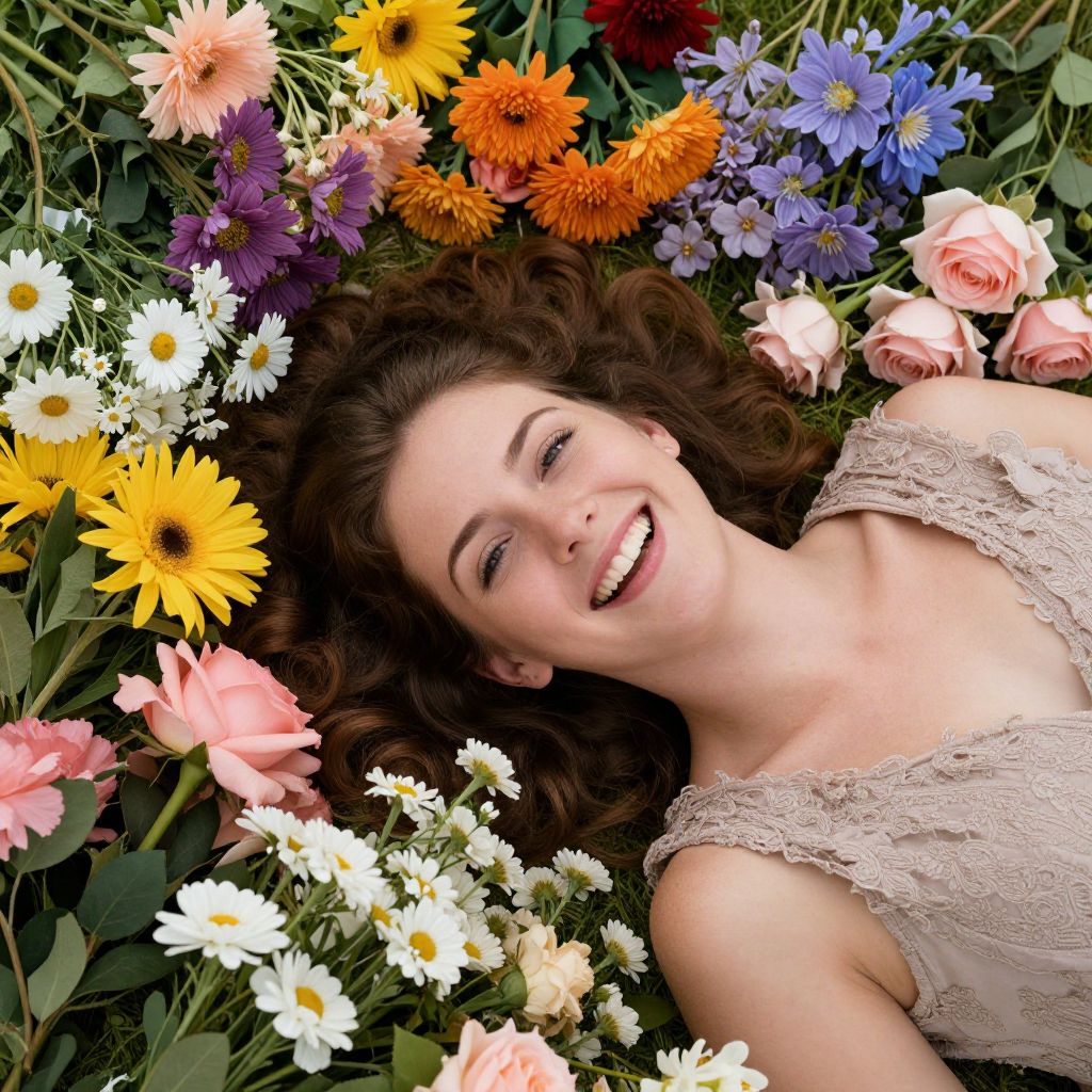 A joyful woman lies amidst a vibrant array of colorful flowers, her face beaming with happiness.