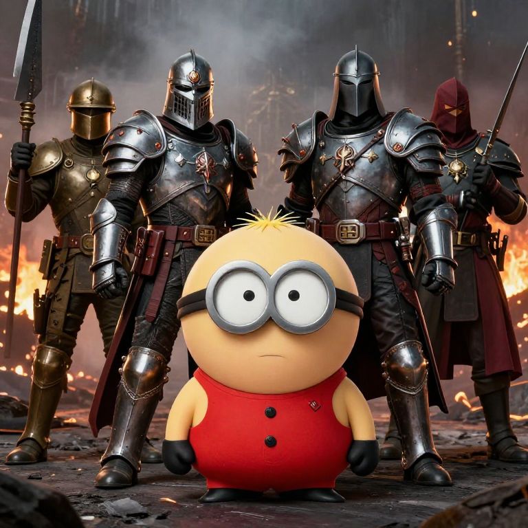 A crossover scene featuring Southpark characters as Warhammer heroes and villains, dramatic lighting highlighting intricate details of battle gear, smoky warzone environment with epic fantasy elements, blending humor with dark military fantasy.