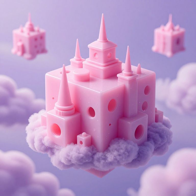 Gelatinous pink cubes float serenely amidst fluffy lavender clouds, adorned with whimsical spires and punctuated by circular apertures, creating a dreamlike cityscape suspended in the ethereal sky.