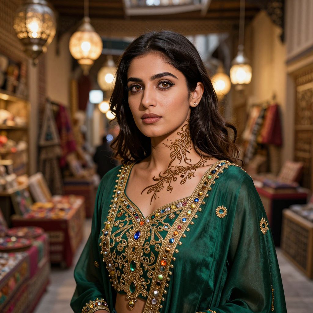 Photograph of a beautiful South Asian woman with medium brown skin and long, wavy black hair. She wears an emerald green, intricately embroidered top with gold and colorful gemstone patterns, and a matching ornate necklace and earrings. She stands in a warmly lit, narrow, bustling marketplace with hanging lanterns and shelves filled with various items in the background. Her expression is calm and confident, with subtle makeup highlighting her features. The market has a cozy, rustic ambiance with rich textures and warm colors.