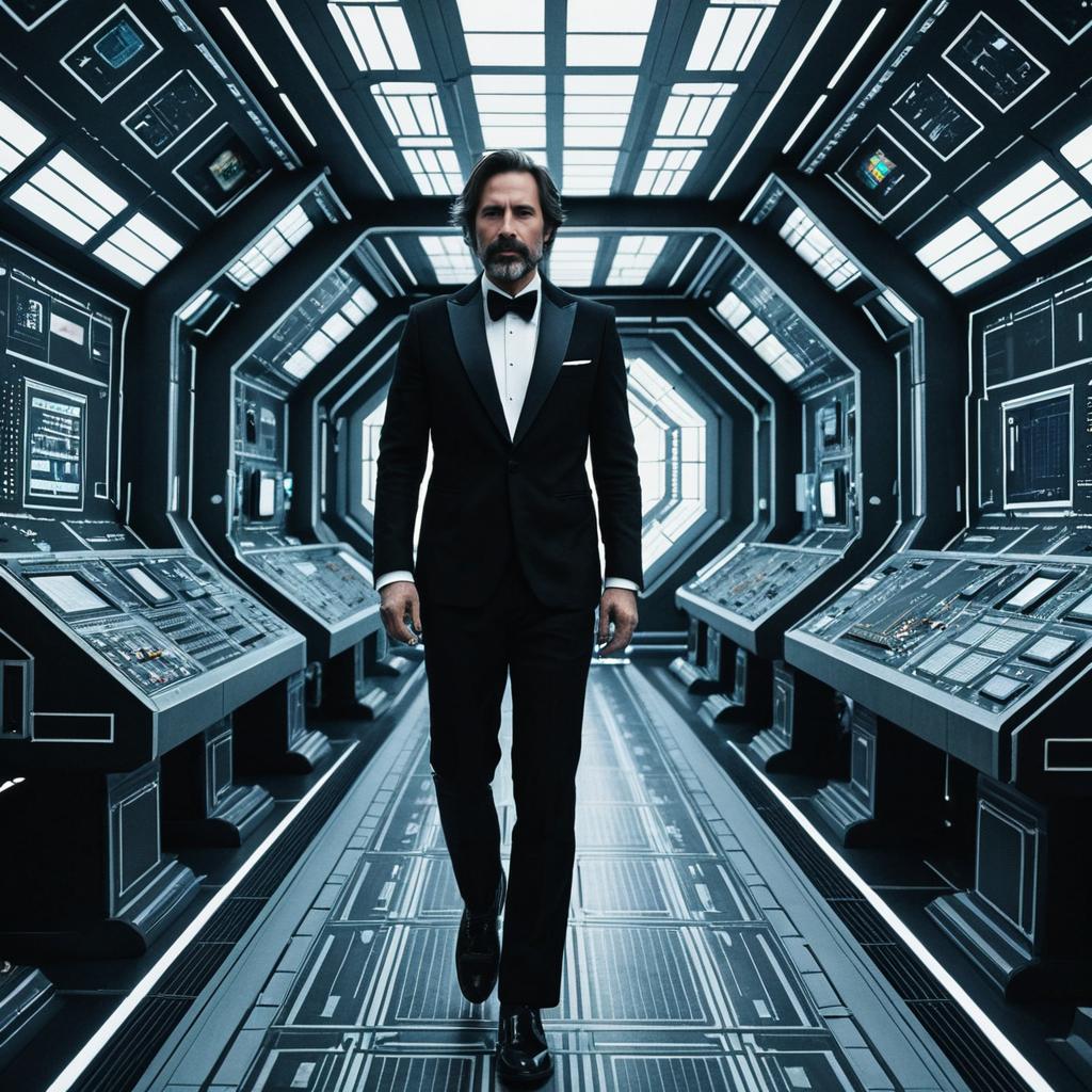 Man in Futuristic Tuxedo in Sci-Fi Control Room
