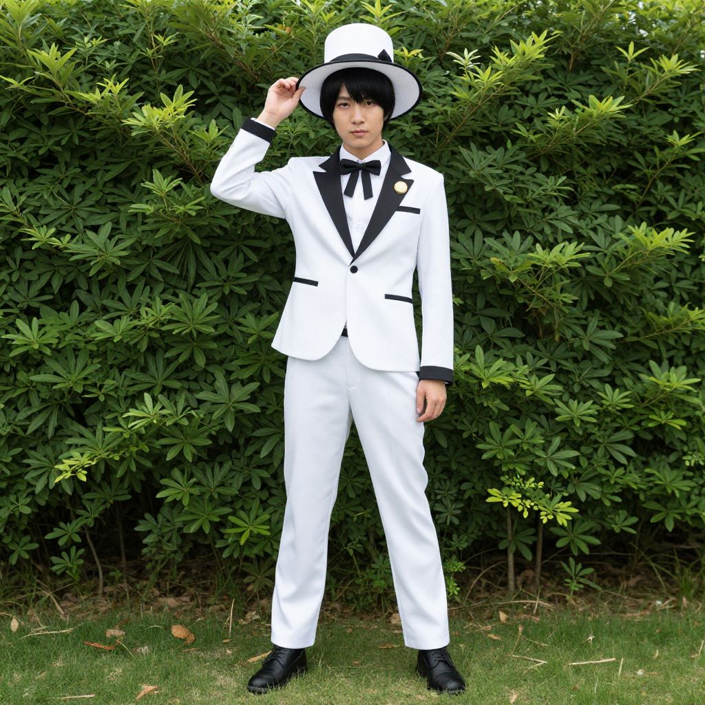 Photograph of an Asian man standing in front of a dense green hedge. He wears a white tuxedo with black lapels and a black bow tie, black dress shoes, and a white top hat with a black band. His black hair peeks out from under the hat, and he holds the hat's brim with his right hand. The grass beneath him is green and slightly uneven. The man's expression is neutral, and he stands confidently with a slight forward lean, creating a stark contrast between his white outfit and the lush green background. The image has a sharp, vibrant quality.