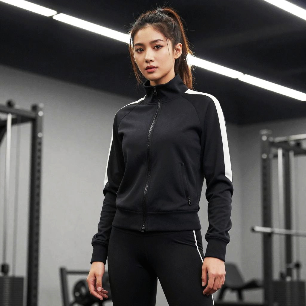 A photograph of an Asian woman in a modern gym. She has straight black hair tied in a ponytail, wearing a black zip-up jacket with white stripes on the sleeves, and black pants. Her expression is neutral, looking slightly to the side. The background shows gym equipment, including weight machines and exercise bikes, under bright fluorescent lights. The gym has a dark ceiling and white walls. The woman's athletic attire and the gym setting suggest she is engaged in or preparing for a workout.