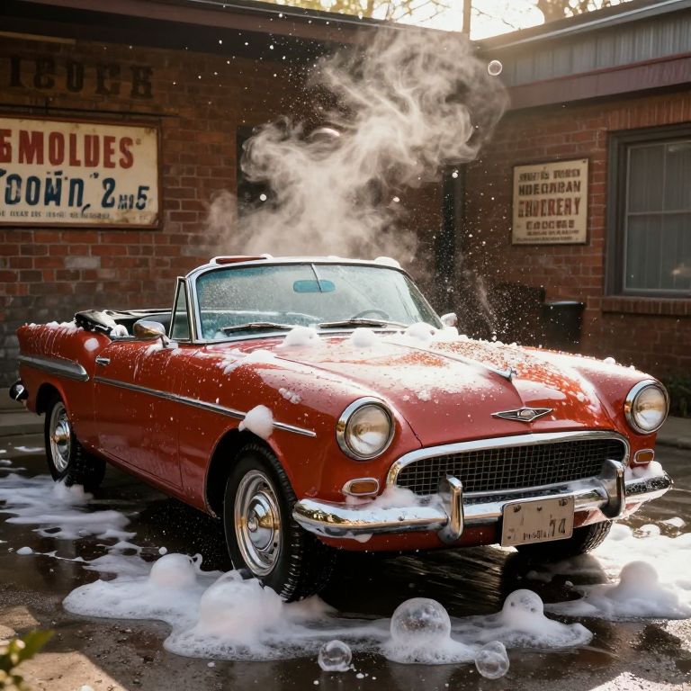 Vintage carwash with an old classic convertible surrounded by colorful foam and bubbles, sunlight filtering through steam, rustic brick walls and old signage, rich warm tones, nostalgic mood with detailed reflections on the wet car surface.