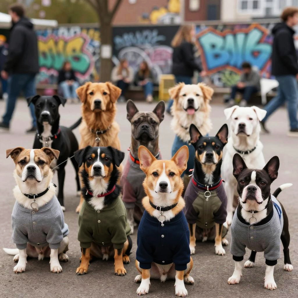 Humanoid dogs in casual streetwear, hanging out in a busy urban park, graffiti background, expressive personalities, natural lighting, diverse breeds with unique features