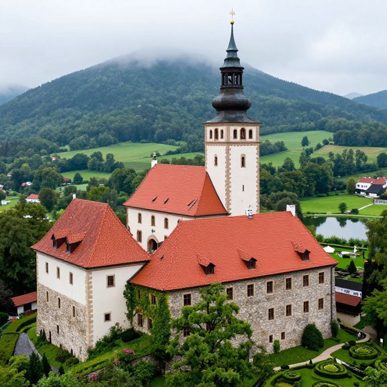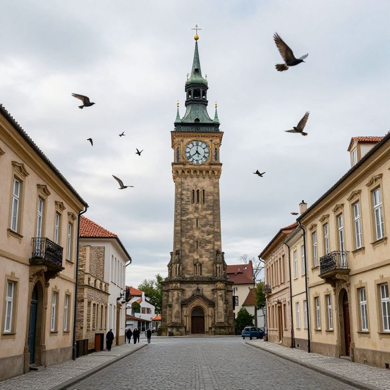 Ancient stone clock tower stands majestically atop a grassy hill, its face adorned with Roman numerals and surrounded by lush green foliage, while intricate golden gears peek through arched windows, blending seamlessly with the serene landscape as birds soar gracefully against a backdrop of rolling hills and fluffy clouds.