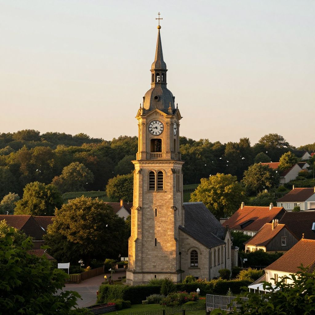 Photograph of a rustic stone church bell tower with a clock and cross, surrounded by lush green trees and a bright blue sky. Two birds fly nearby