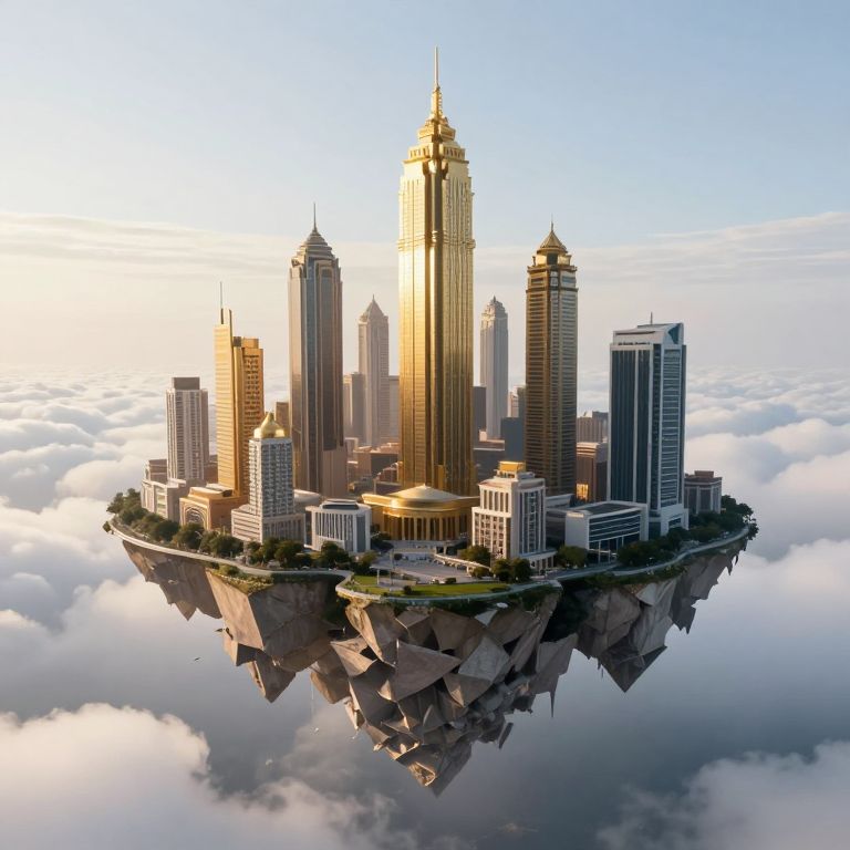 A digitally rendered, surreal image of a floating cityscape suspended mid-air above a sea of fluffy white clouds. The city features a mix of modern skyscrapers with sleek, reflective glass facades and more traditional buildings with pointed roofs. The tallest building, centrally located, has a golden spire, while other buildings vary in height and design. The city sits atop a rocky, angular base, with green patches of grass and small trees. The background includes a bright, clear blue sky with sunlight casting a warm glow on the buildings. The overall style blends realistic architectural details with fantastical elements.
