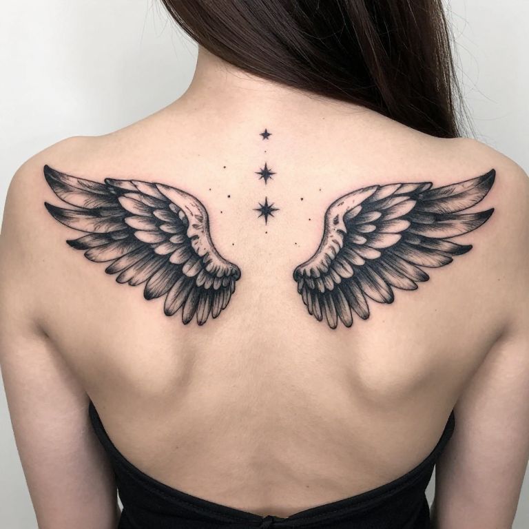 Photograph of a person's upper back, showing a black tattoo with symmetrical angel wings spreading outwards. The wings are detailed with fine lines and have small star-like dots scattered around the center. There are three central stars, aligned vertically. The person has light skin and is wearing a black, low-back top. Hair is dark brown, cascading down the back.