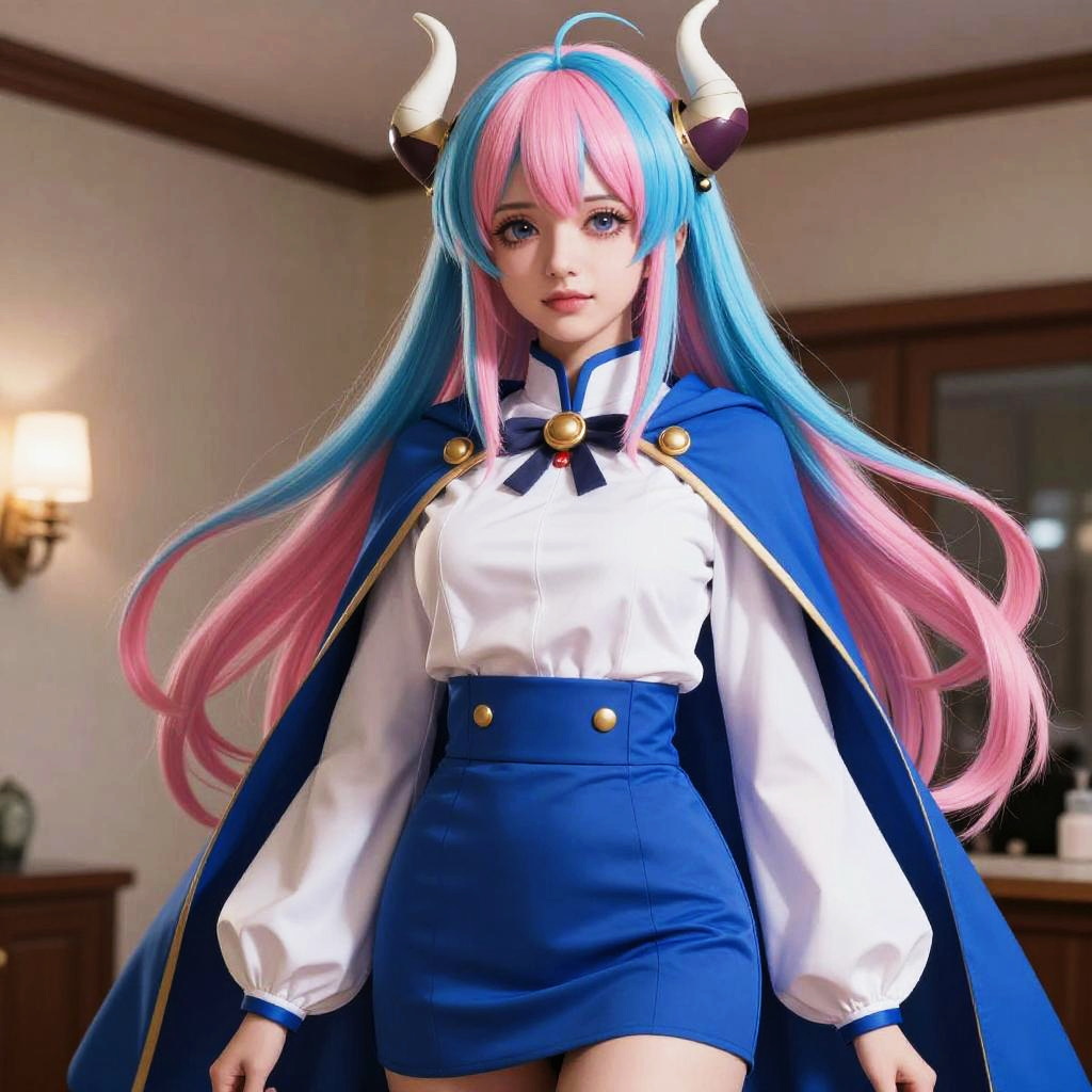 (masterpiece, best quality:1.4), cinematic light, colorful, high contrast, (1girl), UltiOP, onepieceanime, large breasts, multicolored hair, long hair, blue hair, pink hair, bangs, horns, blue skirt, high-waist skirt, white shirt, long sleeves, blue cape, indoors