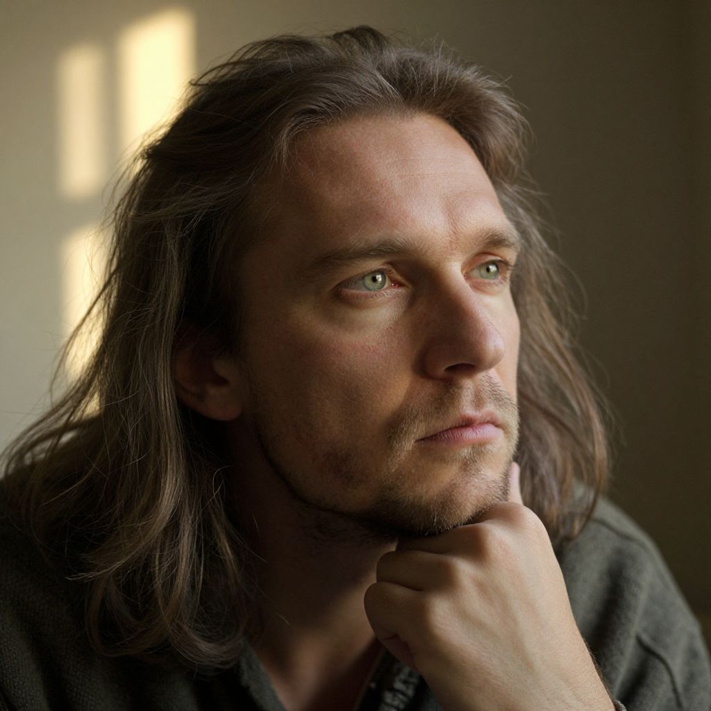 Photograph of a contemplative man with long brown hair, light green eyes, and a slight stubble, resting his chin on his hand, softly