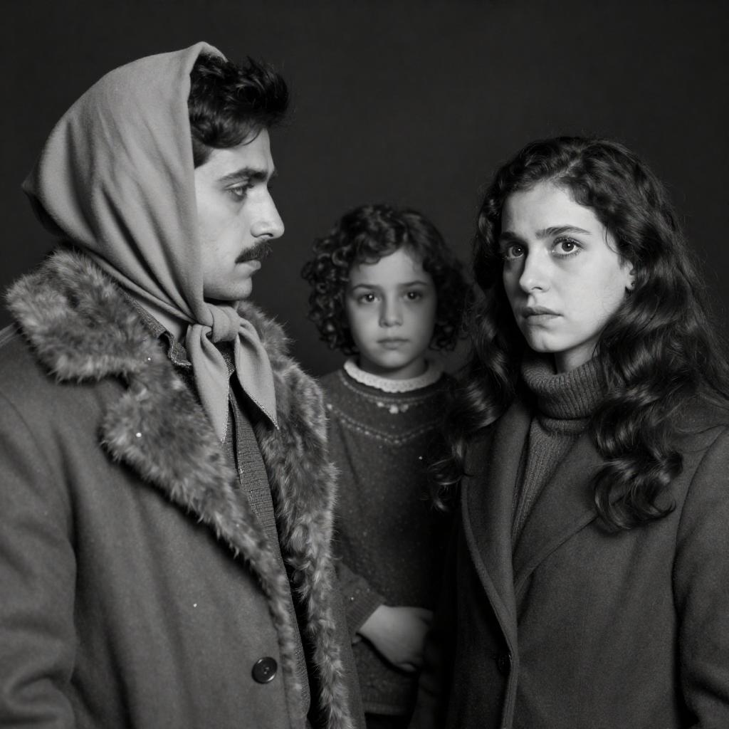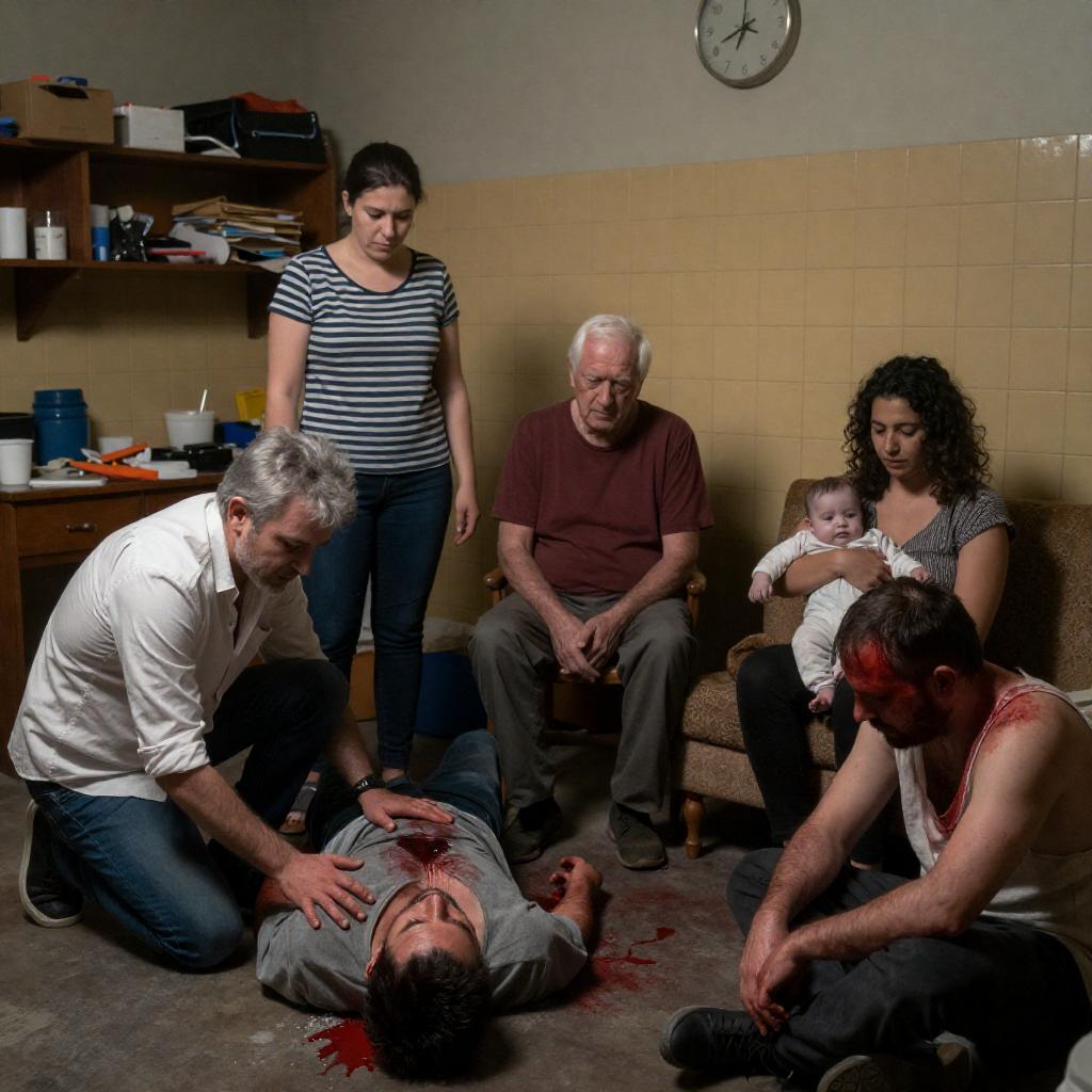 Photograph of six people in a dimly lit room. Five people sit at a table, focusing on papers and a candle. One person stands behind, holding a folder. Warm, orange lighting. Tablecloth with red pattern. Candle in center. People have varied expressions: attentive, focused, neutral. Two men, three women, one bald. Dark, ured background.