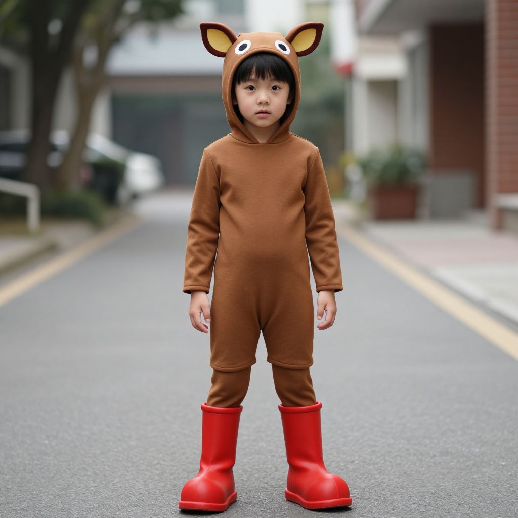 Huggy Wuggy Costume, asian boy in a brown outfit and red boots