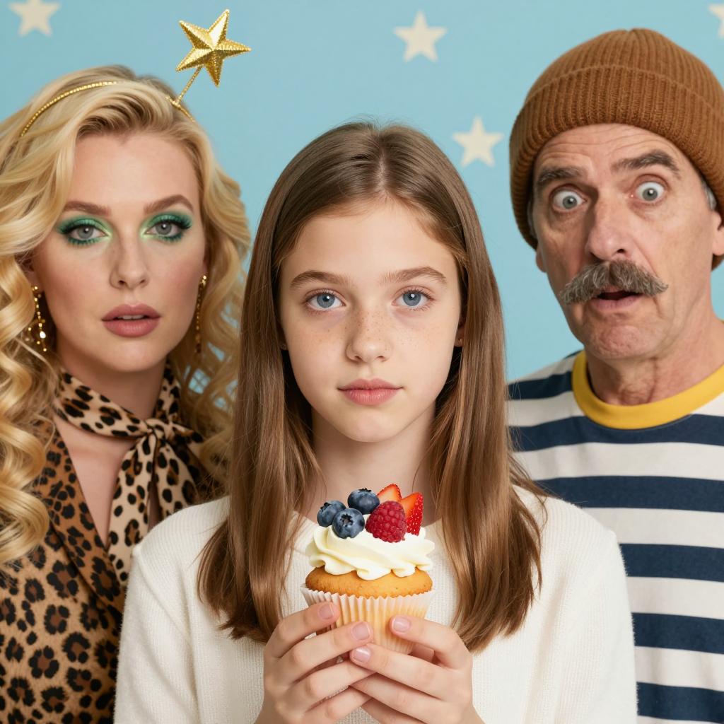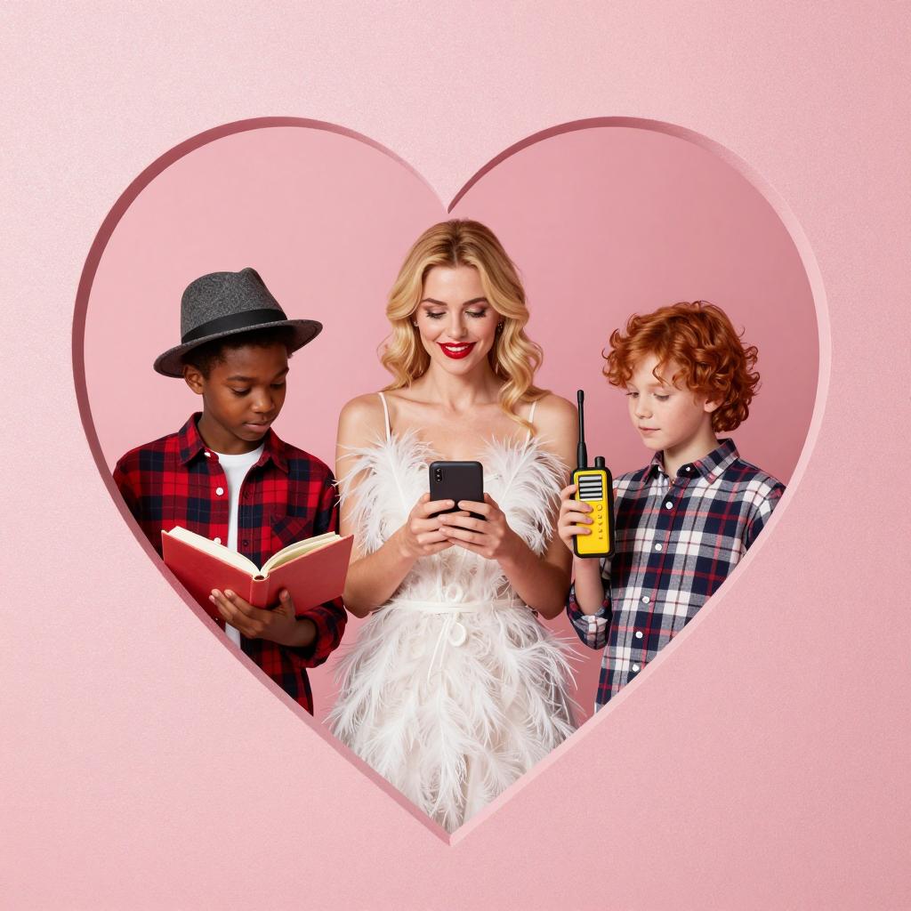 Three people inside a heart-shaped frame on a pink glittery background. A blonde woman with red lipstick and white feathered dress holds a phone. A black child in a hat and red plaid shirt holds a book. A red-haired child in a plaid shirt holds a toy walkie-talkie. The woman is in the center, children on the left and right.