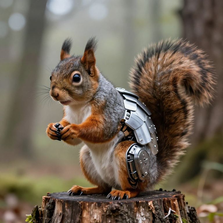 A detailed Mark Rober squirrel 3.0, combining nature and advanced robotics, blending soft fur with polished armor plates, standing alert on a tree stump in a misty woodland, futuristic and natural elements fused, photorealistic style