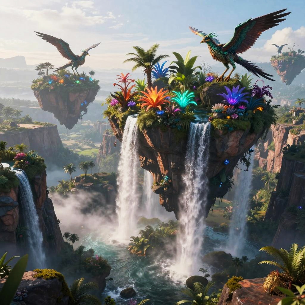 Flying islands suspended in mid-air above a vast canyon, featuring cascading waterfalls and exotic plants glowing in neon colors, inhabited by winged creatures, rendered in cinematic style with soft sunlight filtering through mist.
