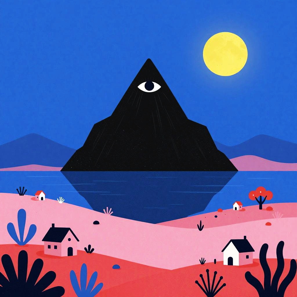 This digital artwork features a surreal landscape with a black, triangular mountain in the center, an eye at its peak, and a yellow moon in a bright blue sky. The foreground is a colorful, pinkish-red terrain dotted with whimsical, tiny houses and abstract plants. The background shows a calm blue lake reflecting the mountain. The style is vibrant and surreal, with bold colors and abstract shapes.