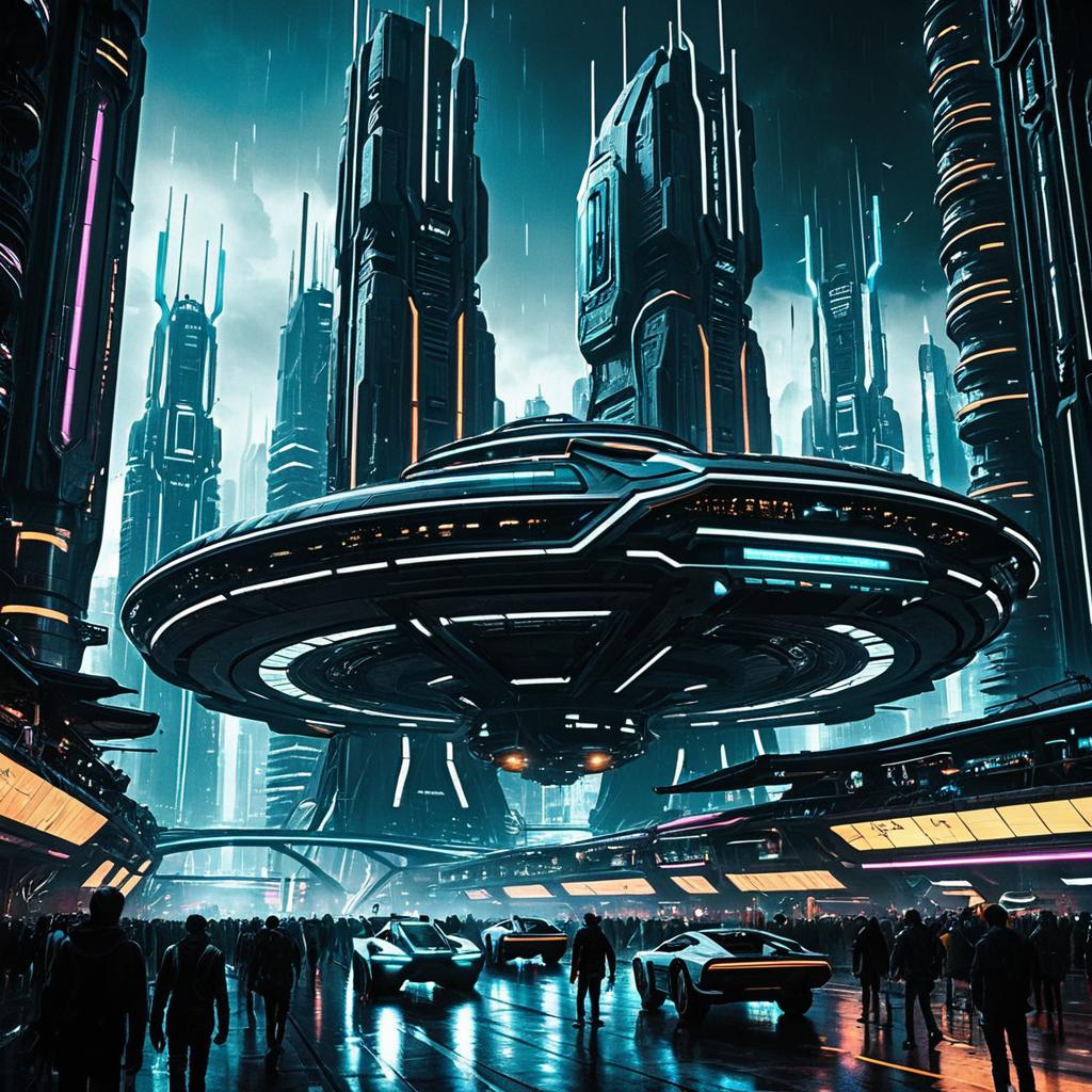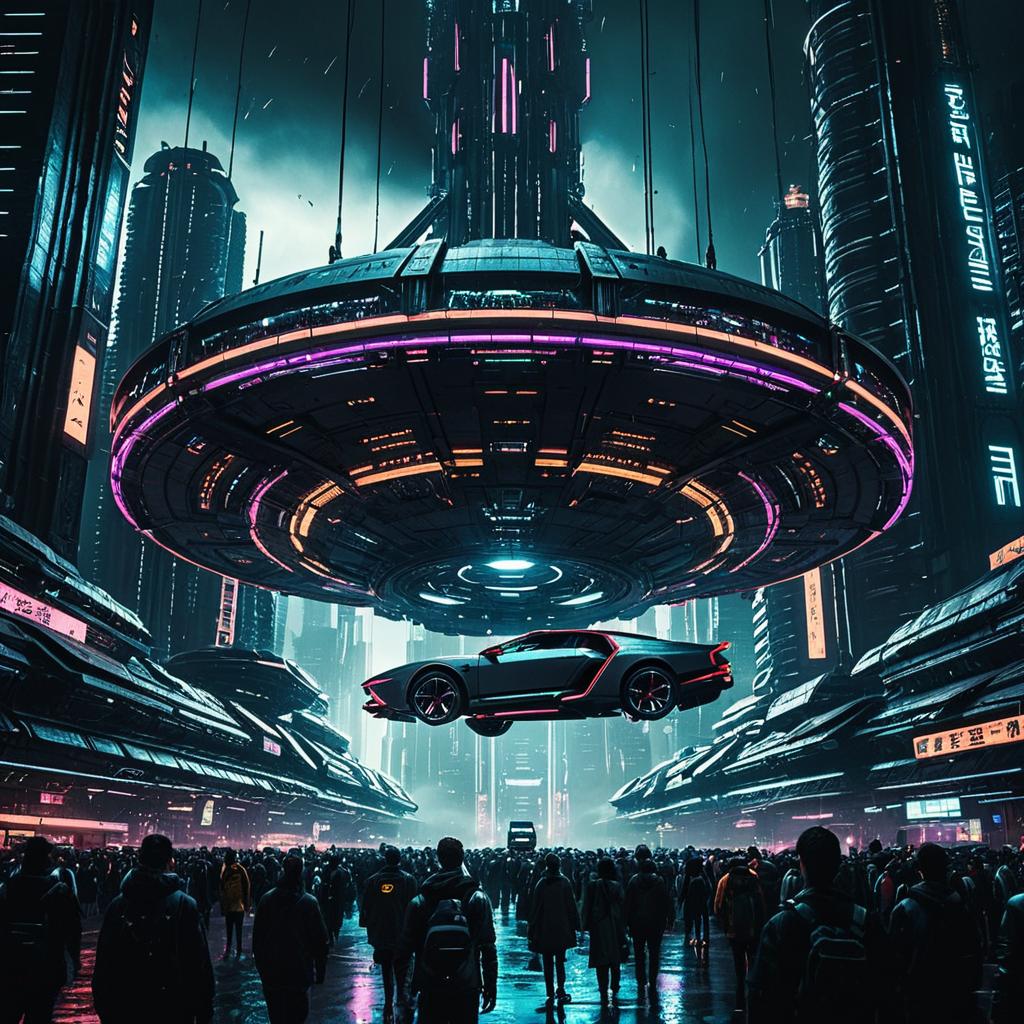 Futuristic cyberpunk floating arcology with neon lights, flying cars, towering buildings, bustling crowd, dark and moody atmosphere, Ghost in the Shell-inspired.