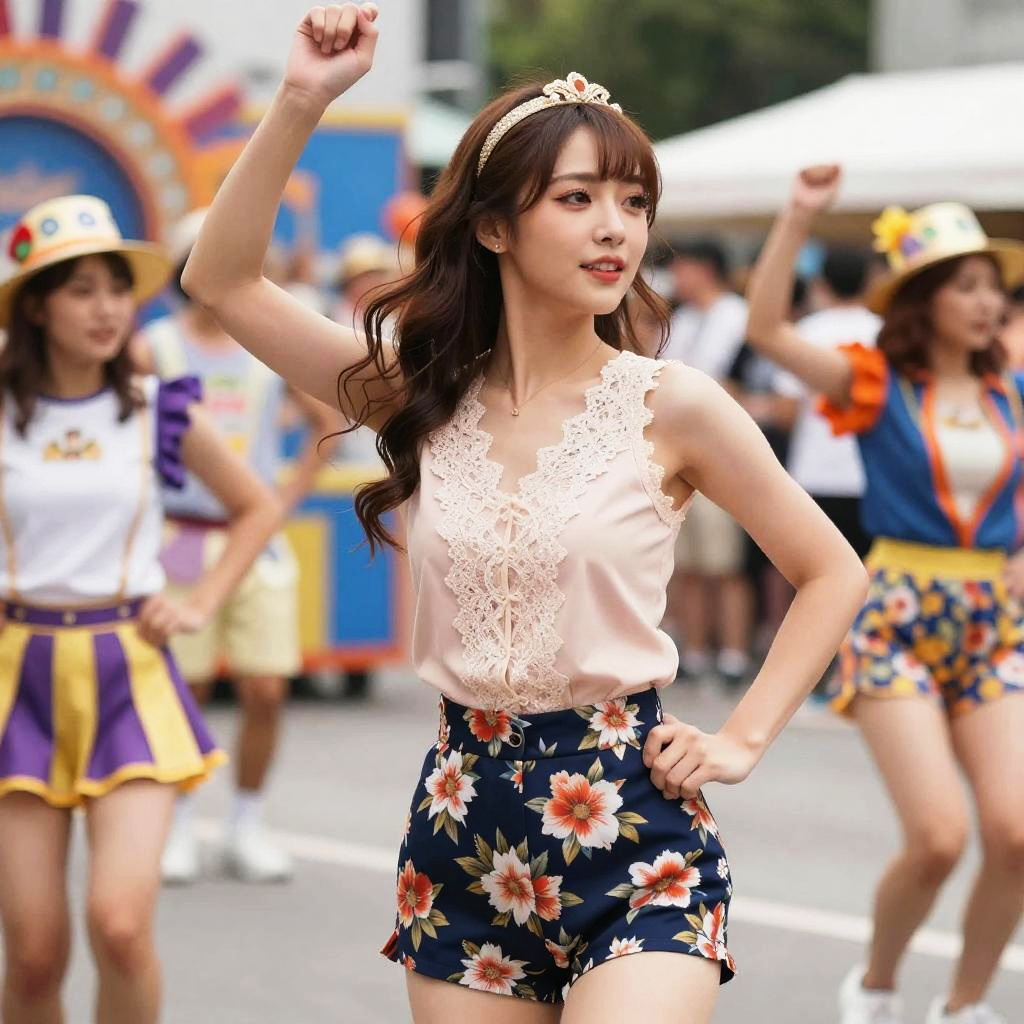 A woman in a tokyopop style, wearing a blush sleeveless top with lace detailing and high-waisted navy blue floral shorts, enjoying a vibrant carnival dance troupe. Sexy. Pretty face and beutiful eyes