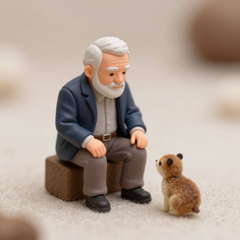 A detailed, hyper-realistic miniature scene featuring an elderly man and a small animal, surrounded by soft, wool-like textures, with a focus on volumetric lighting and a chibi aesthetic.