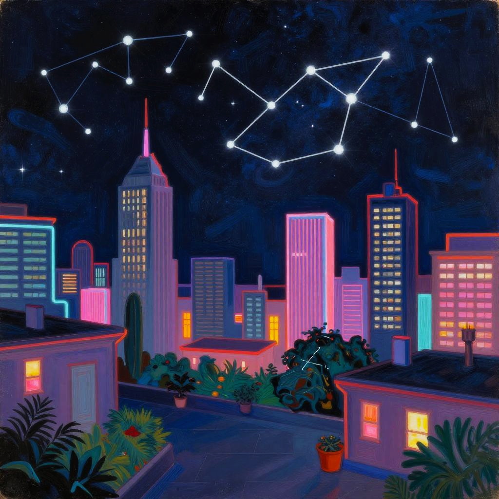 A neon production still of Julie Mehretu's cosmic cityscape, an abstract painter drawing constellations with energetic lines, starlit rooftop garden overlooking neon skyscrapers, hyperrealistic, 500mm, vintage aesthetic.