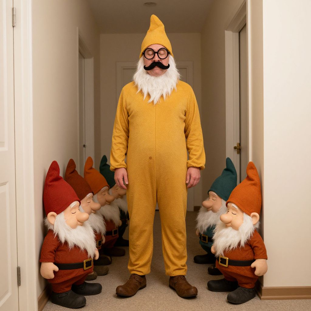 Photograph of a person in a yellow gnome costume standing in a narrow, white-walled hallway. The costume includes a pointed hat, black-rimmed glasses, a white beard, and brown shoes. Surrounding the person are six smaller gnome figurines, each with red or orange hats, white beards, brown belts, and black boots, positioned in a semi-circle on the beige carpeted floor. The door frames and closed doors are visible on both sides of the hallway, creating a stark contrast with the brightly colored costumes. The lighting is even, highlighting the vivid colors of the costumes and figurines.