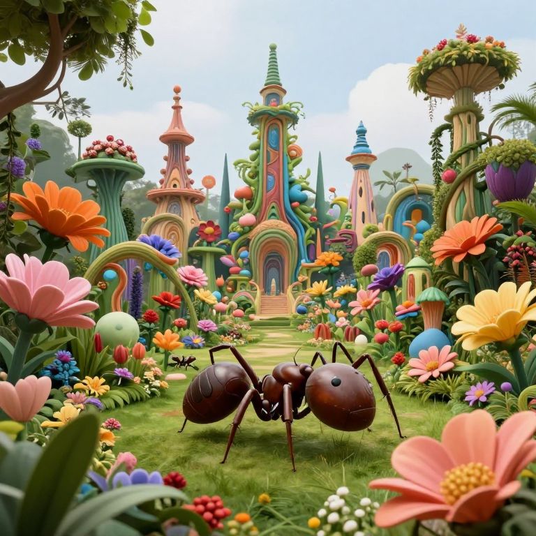 Vibrant CGI fantasy garden with colorful flowers, a whimsical, multicolored castle, and a large, detailed brown ant in the foreground.