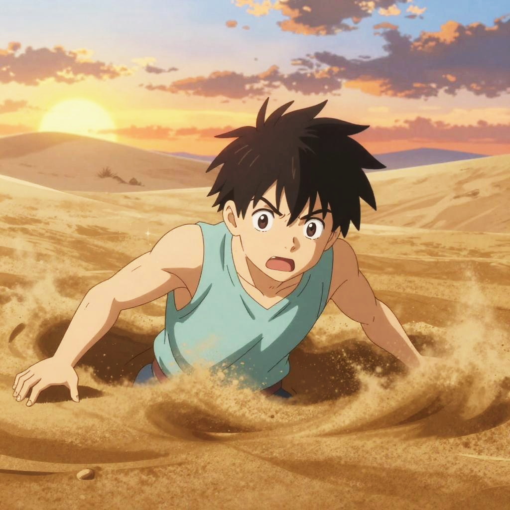 Quicksand anime scene depicting a young hero trapped in swirling golden sand, with vibrant sunset colors and detailed expressions, dramatic tension in a mysterious desert landscape, anime style with dynamic shadows and glowing highlights.