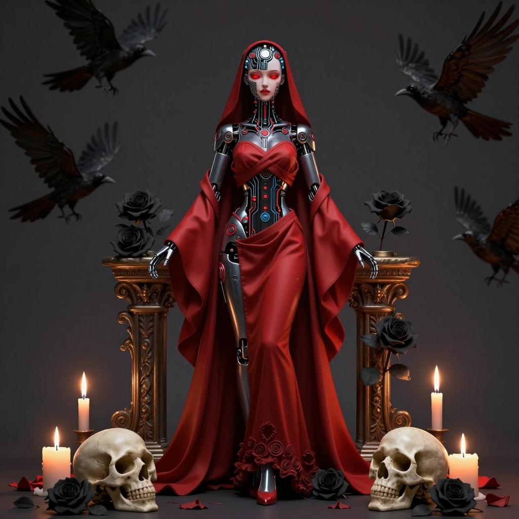 Full-body cyberpunk style sculpture of a young, beautiful dark priestess, half android with exposed circuitry on her head and glowing red eyes. She is dressed in flowing blood red silk fabric, surrounded by baroque elements including ornate golden pillars, black roses, human skulls, lit candles, and flying crows in the background. The scene is hyper-realistic with cinematic lighting, showcasing intricate details and depth of field.