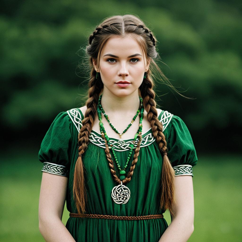 Portrait of a young woman wearing a traditional green Celtic dress with white embroidered patterns. She has long brown hair styled in multiple braids, including twin braids framing her face. The woman wears green beaded necklaces, one with a detailed Celtic pendant. The background is blurred greenery, focusing attention on her calm expression and traditional attire.
