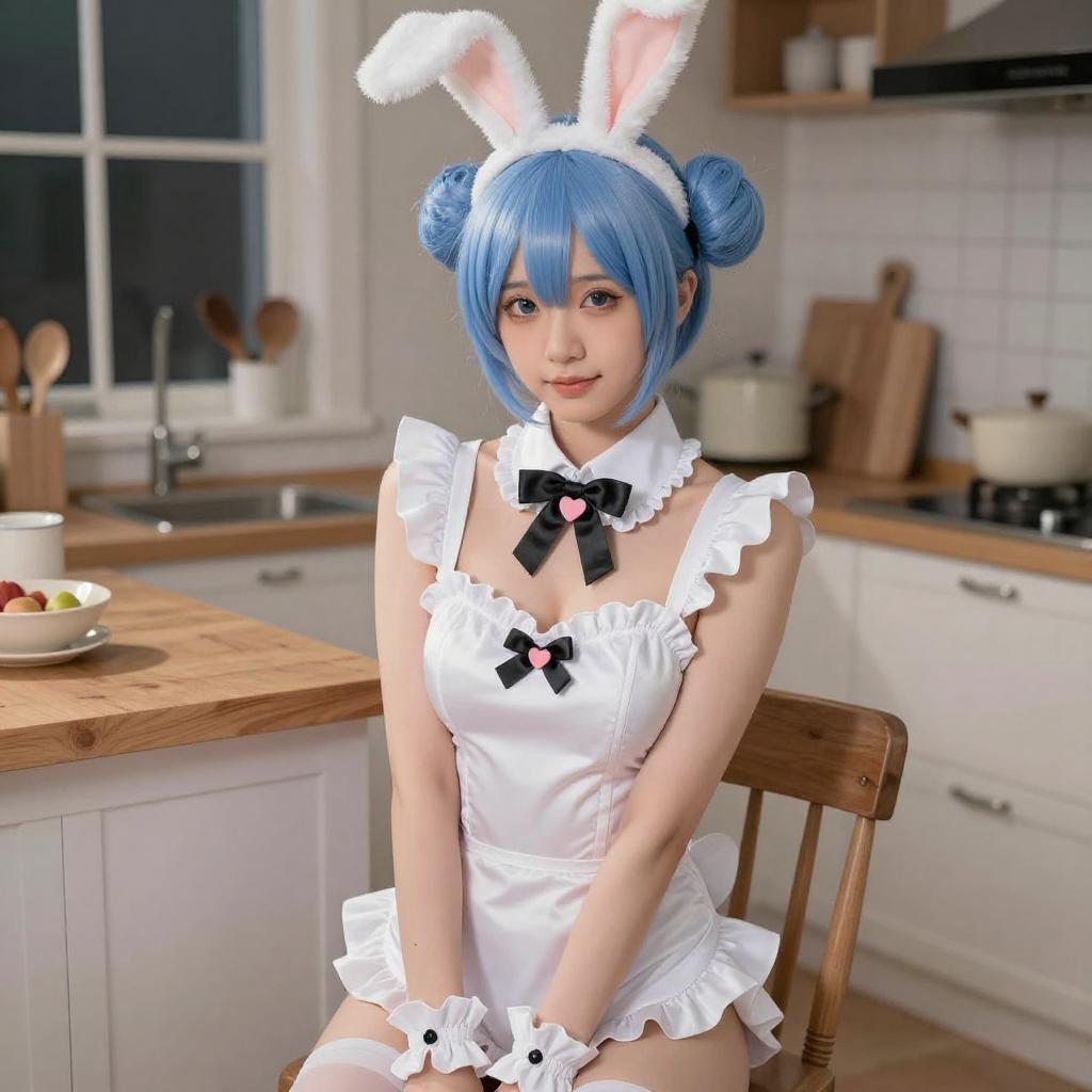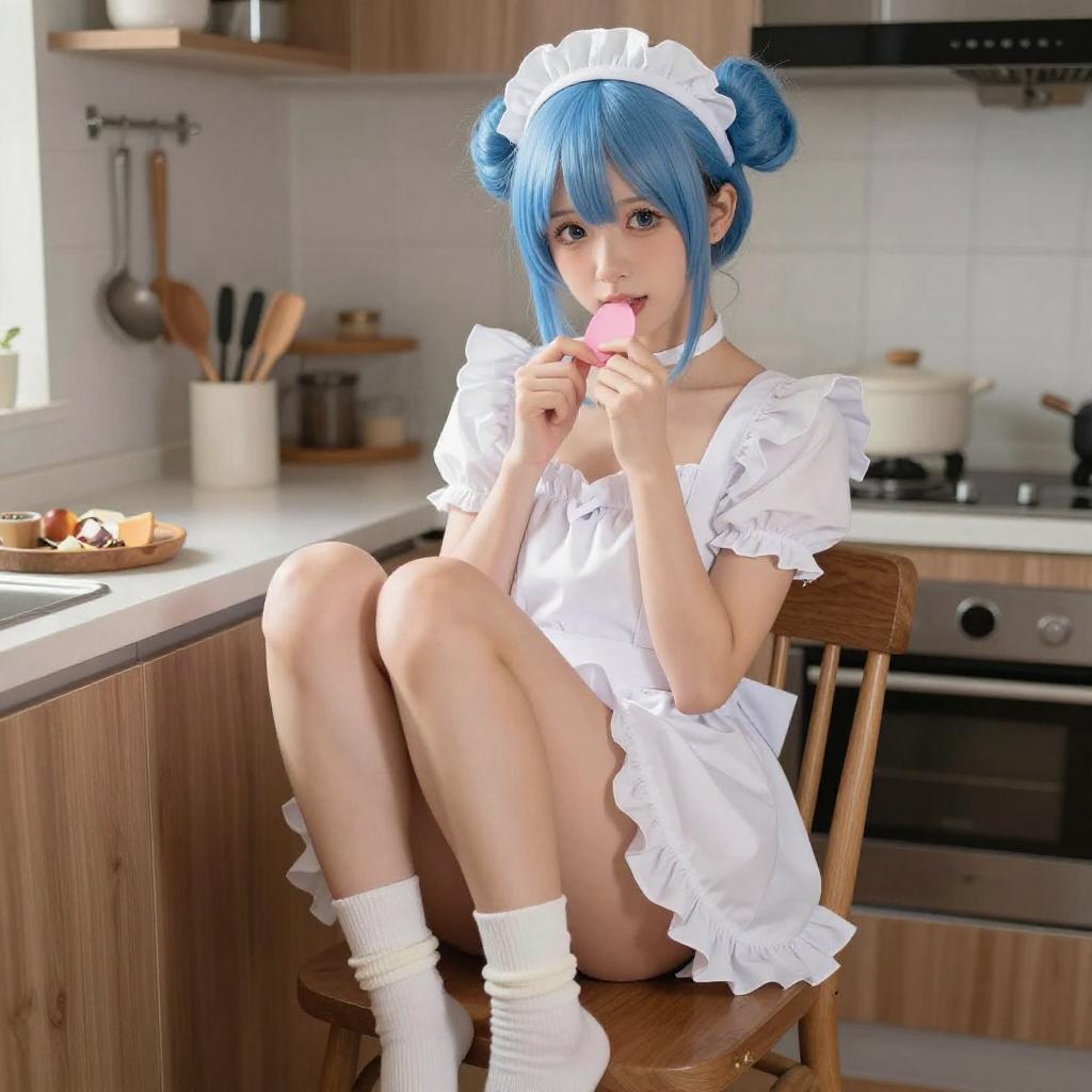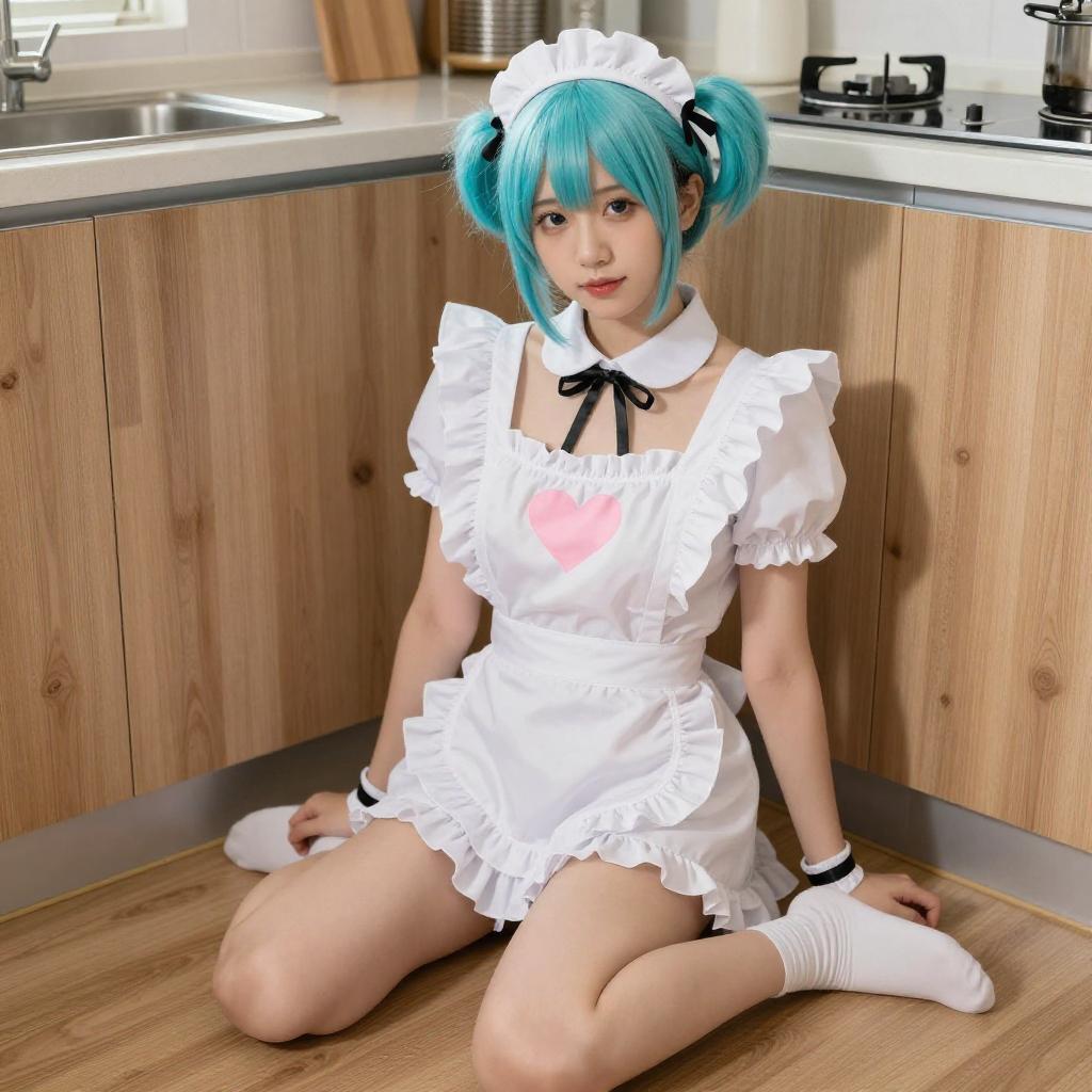 Photograph of a woman with turquoise blue hair in a ponytail, wearing a white maid outfit with a short skirt, white socks, and no top, leaning over a wooden kitchen counter. She is looking back over her shoulder with a playful expression, her buttocks prominently displayed. A modern kitchen with a stainless steel faucet and a warm, overhead lamp is in the background.
