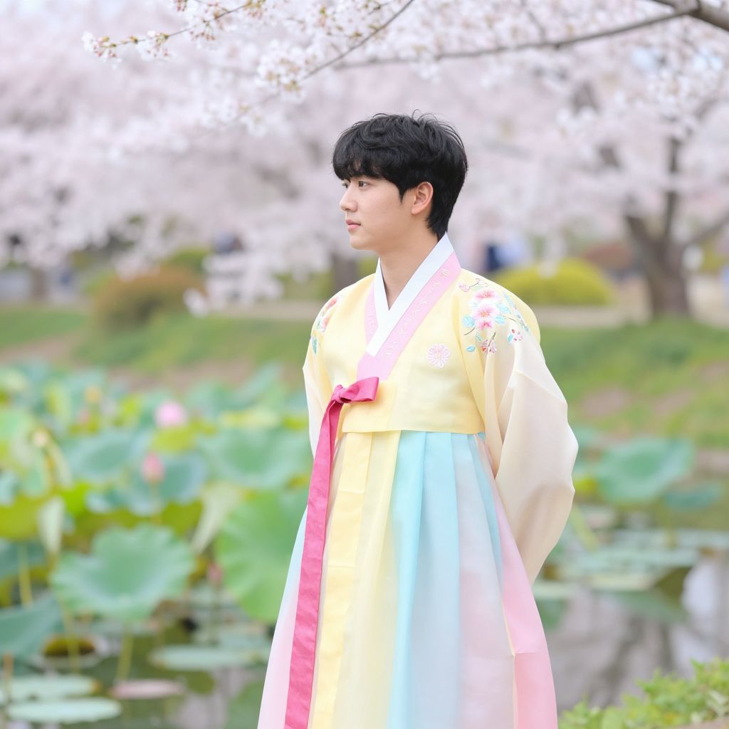 Traditional hanbok male in bright pastel-colored hanbok, adorned with delicate floral embroidery, standing beside a tranquil lotus pond surrounded by blossoming cherry trees in spring, soft focus background, vibrant yet calming atmosphere emphasizing cultural tradition and natural beauty.