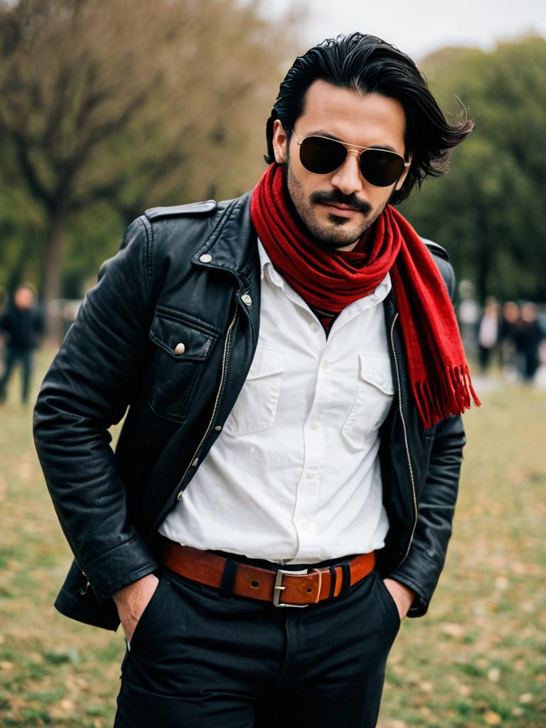 Stylish young man wearing black leather jacket, white shirt, black pants, brown belt, and red scarf standing outdoors with hands in pockets. He has black hair, a mustache, and is wearing dark sunglasses. The background shows a blurry park setting with autumn leaves and trees.
