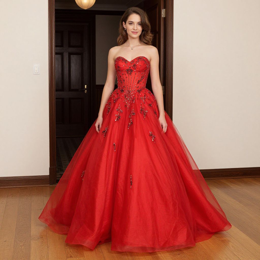 Radiant young woman posing elegantly in a vibrant red ball gown adorned with sparkling embellishments, standing indoors with a wooden floor and a doorway visible behind her, exuding grace and celebration.