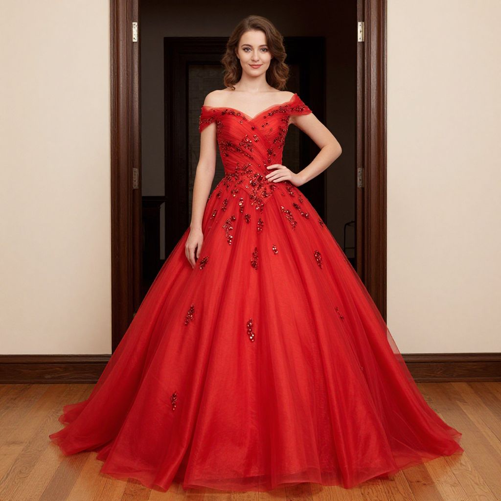 Photograph of a young woman with fair skin and wavy brown hair, standing in a doorway. She wears an off-the-shoulder, floor-length red ball gown adorned with intricate black and red beadwork. The gown has a fitted bodice and a voluminous, tulle skirt that flares out. She stands confidently with one hand on her hip. The background features a dark wooden doorframe set in a beige wall, with a wooden floor below. The lighting is bright, highlighting the vivid red of the dress. The woman's makeup is subtle, emphasizing her natural beauty.