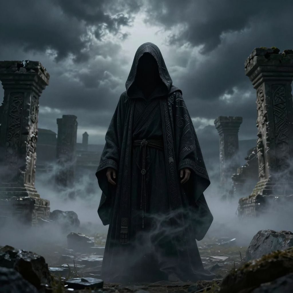 Hooded Figure in Ancient Cathedral